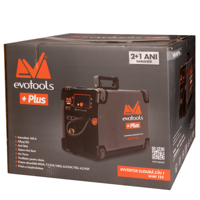 Bringen Sie Ihre Projekte auf das nächste Level mit dem Schweißinverter EvoTools +Plus® WMI 135, einem hochmodernen, vollständig digitalisierten Gerät. Dieses vielseitige Gerät bietet drei wesentliche Schweißverfahren: MMA, MIG/MAG (mit Gas oder gaslos/FCAW) und TIG Lift und ist damit die ideale Lösung sowohl für Instandhaltungswerkstätten als auch für Heimwerker, die Präzision und Leistung in einem kompakten Format benötigen.