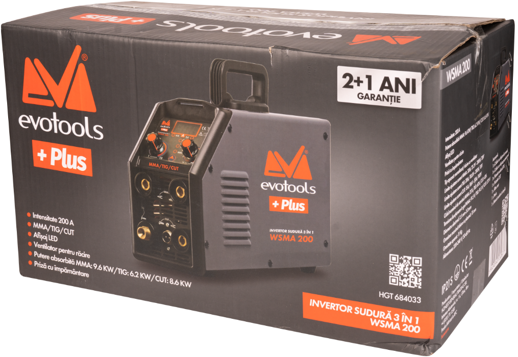 Beschreibung:Schweißinverter 3 in 1 mit LED-Anzeige MMA/TIG/CUT WSMA200 EvoTools +Plus®.