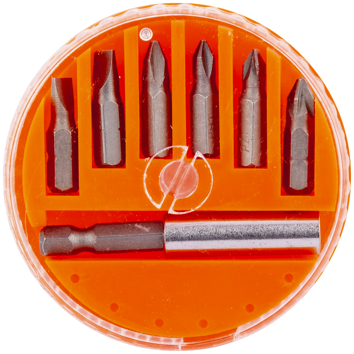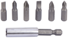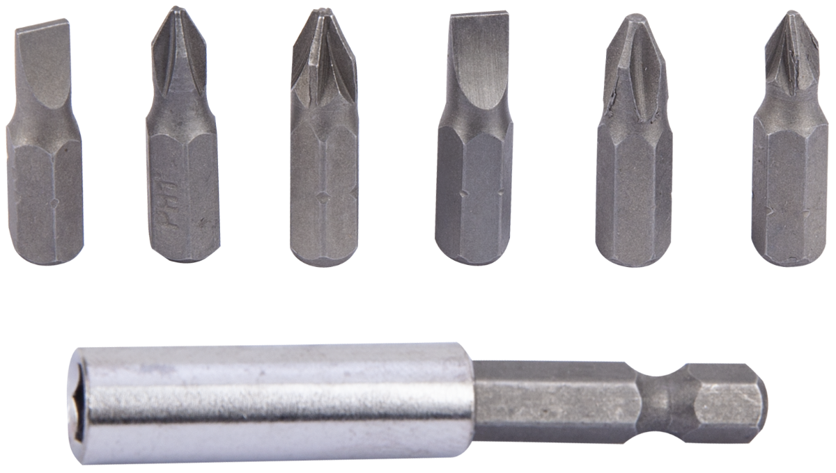 Die Schraubendrehereinsätze bestehen aus wärmebehandeltem Kohlenstoffstahl. Die Verlängerung ist 60 mm lang. Sowohl die Verlängerung als auch die Bits sind magnetisch und sorgen für guten Halt.